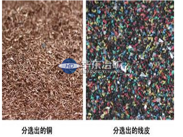 該型銅米機(jī)由粉碎機(jī)、輸送機(jī)、共振篩、離心風(fēng)機(jī)、除塵器幾部分組成。物料由進(jìn)料口進(jìn)入粉碎機(jī),粉碎后的物料由輸送機(jī)送到共振篩,在共振篩風(fēng)機(jī)的共同作用下銅和塑料分離開由兩端分別流出,灰塵雜質(zhì)由風(fēng)機(jī)送到除塵器中集中起來。