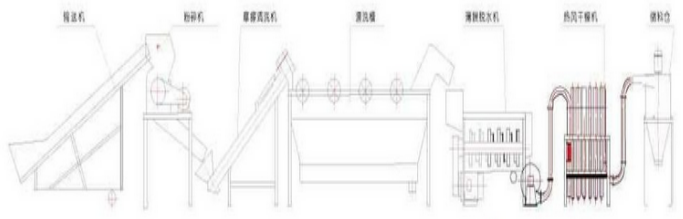 由輸送機(jī)將原料送至破碎,預(yù)碎機(jī)已速比1:35的超低轉(zhuǎn)速,用雙刀盤將塑料撕裂,切碎至3-10CM片狀,然后將片狀原料送至,二次粉碎機(jī),通過合金刀盤的高速轉(zhuǎn)動(dòng)將其破碎,粉碎機(jī)底部有出料篩網(wǎng),可根據(jù)需要控制出料尺寸,出料后,由水力清洗機(jī)對(duì)塑料進(jìn)行清理,再由脫水機(jī)進(jìn)行脫水作業(yè),脫水后的塑料顆粒可以直接送至,氣流烘干送至料倉,作為再生塑料備料儲(chǔ)存。